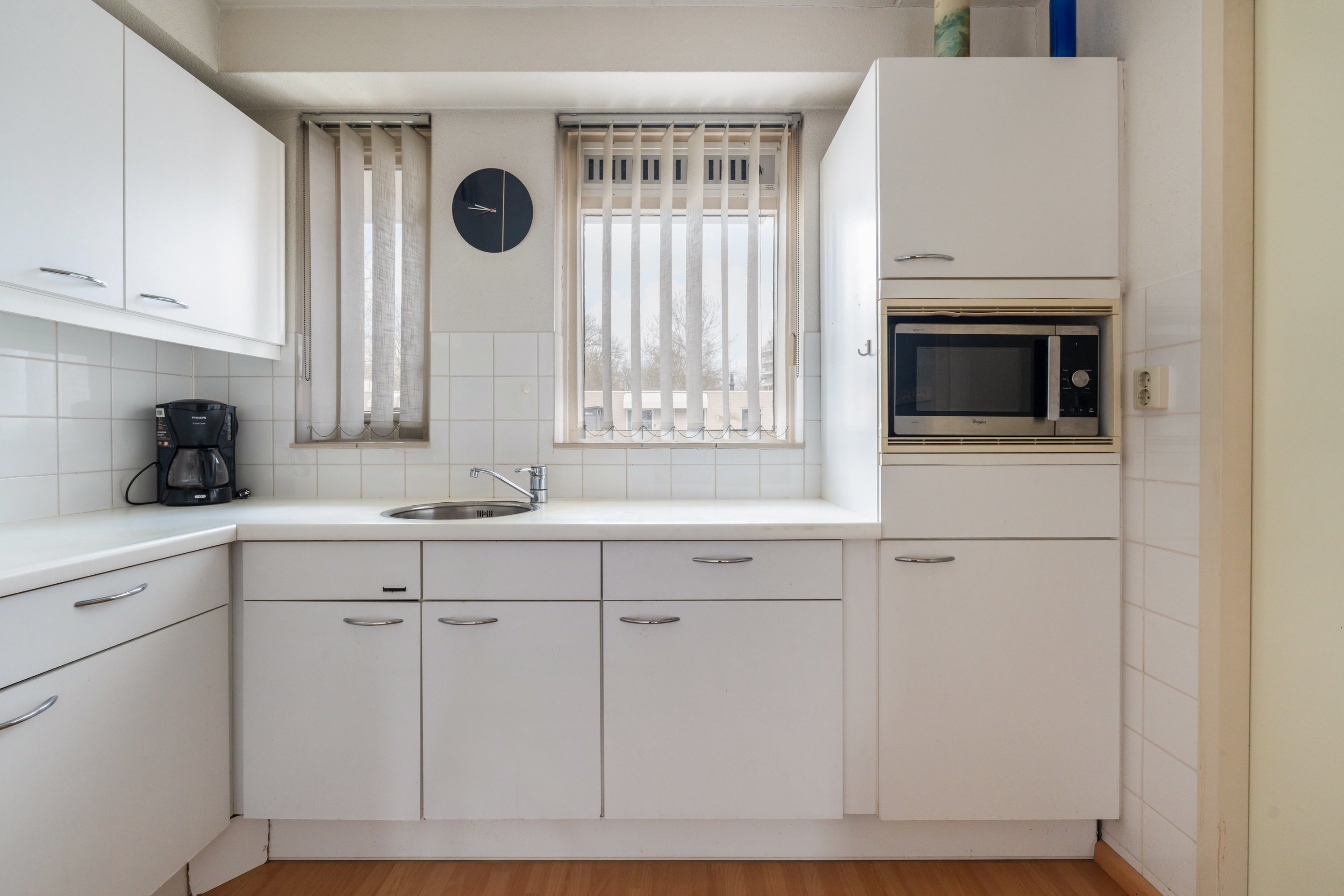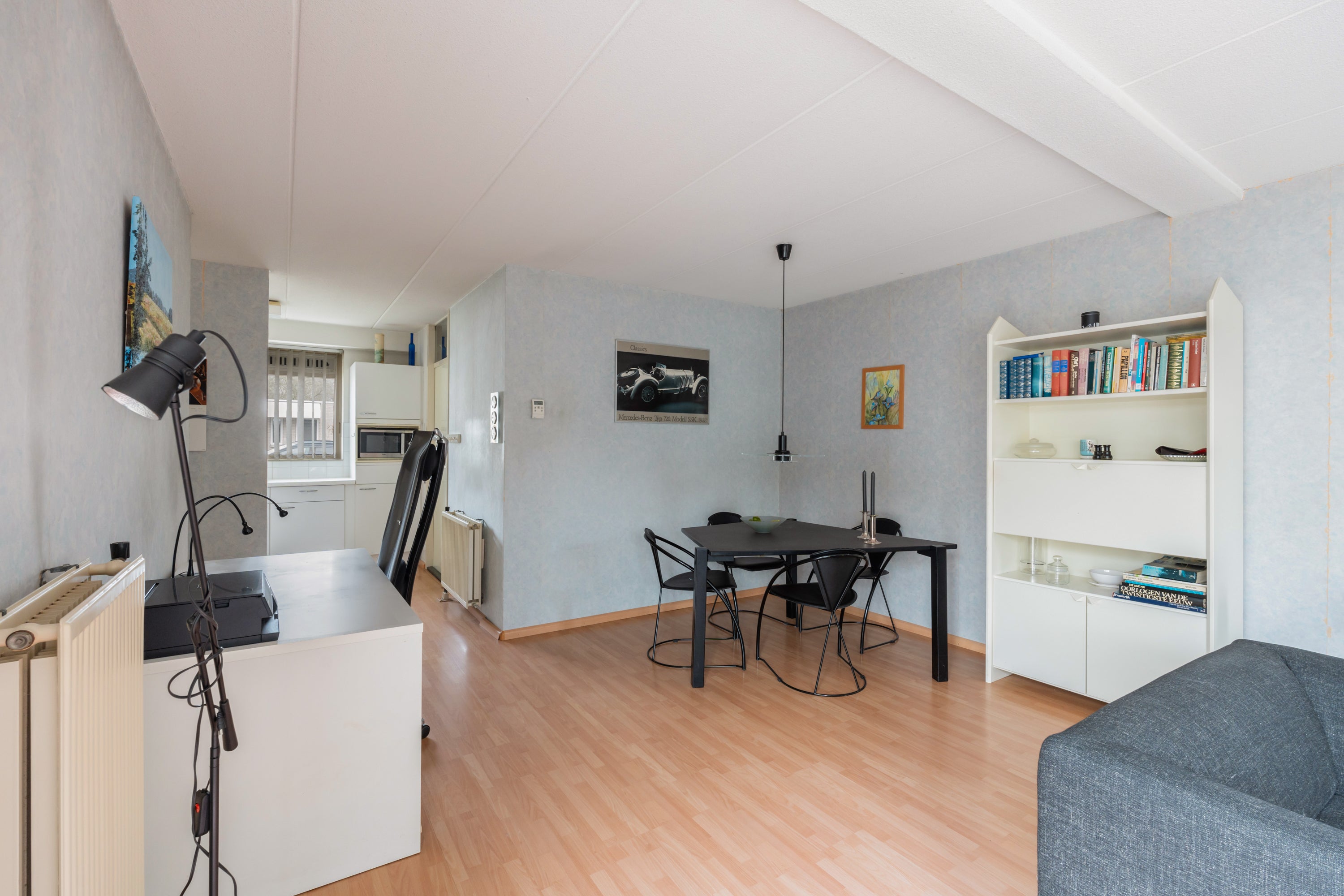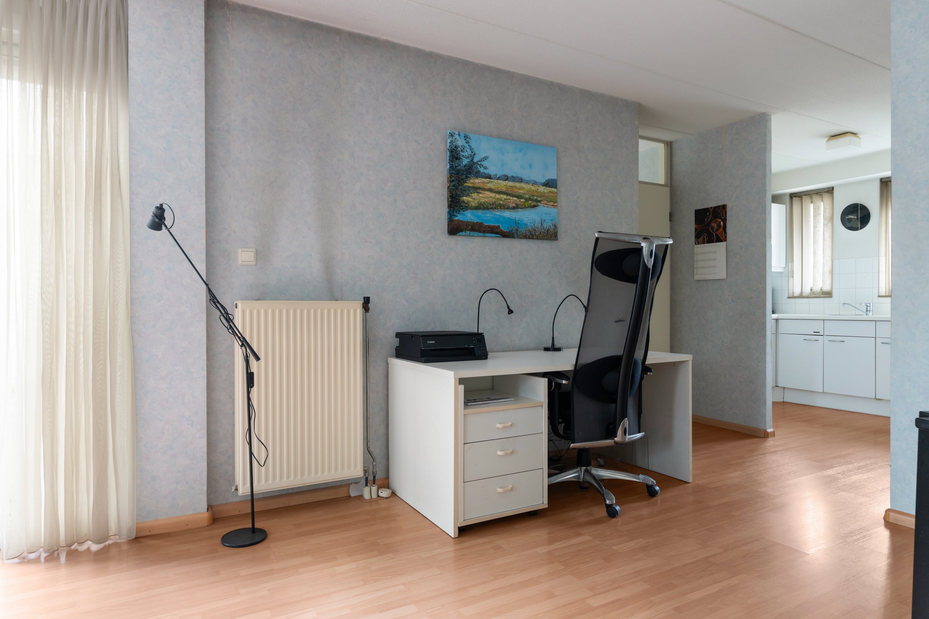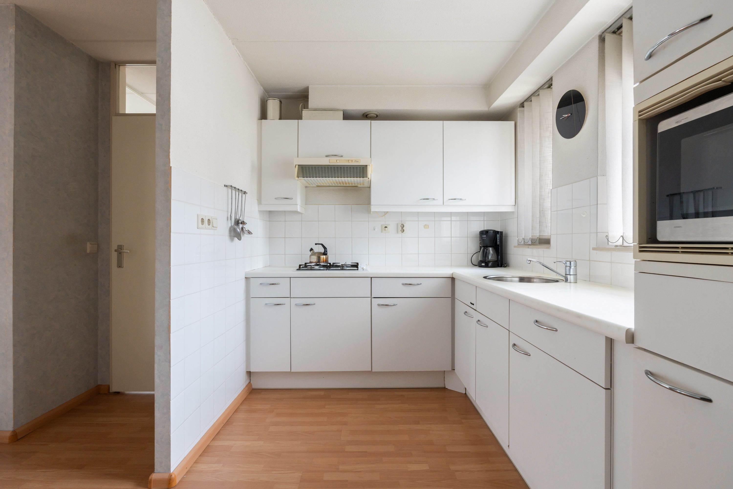 De halfopen keuken heeft een eenvoudige opstelling en beschikt over een 4-pits gaskookplaat. Aangrenzend is een praktische bijkeuken voor de wasmachine en cv-ketel. De hoofdslaapkamer meet 12m2, terwijl de tweede slaapkamer ongeveer 8m2 groot is. De neutrale badkamer heeft een douchecabine en is voorzien van mechanische ventilatie.