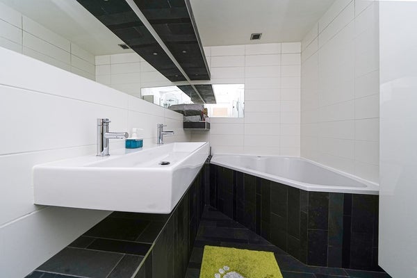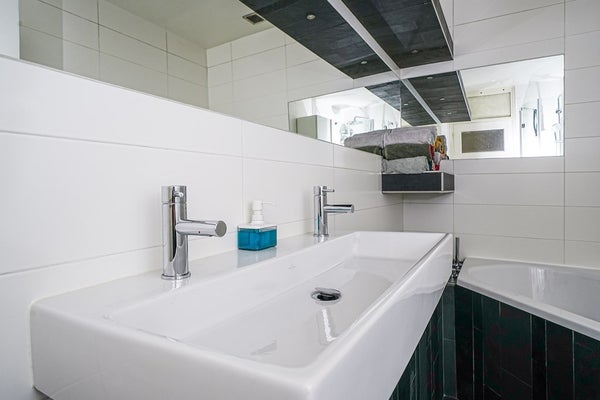 De badkamer is hoogwaardig afgewerkt en voorzien van alle moderne gemakken. Zo beschikt deze over een 2-persoons jacuzzi, een breed wastafelmeubel met twee kranen en een ruime douchehoek met regendouche en handdouche. Alle kamers op deze verdieping zijn voorzien van een houtlook laminaatvloer en strak afgewerkte wanden.