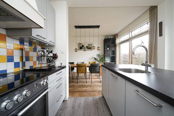De open keuken is modern en luxe uitgevoerd en beschikt over een kookeiland, waardoor koken en samenzijn naadloos in elkaar overlopen. Er is prettig contact met de eetkamer en fraai uitzicht op de tuin. Het kookeiland is voorzien van veel kastruimte, een vaatwasser en een spoelbak met mengkraan en kokend-waterkraan. De hoge kastenwand aan de zijkant beschikt over een koelkast, vriezer en oven. Daarnaast is er een vrijstaand inductie fornuis met twee ovens, een grill, een afzuigkap en volop opbergruimte. Grote raampartijen aan de achter- en zijkant zorgen voor veel licht en zicht op de achtertuin.