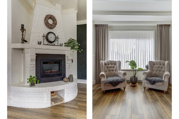 vloerafwerking en een karakteristieke schouw. De aangrenzende keuken heeft een landelijke uitstraling,