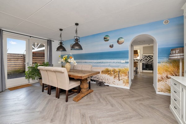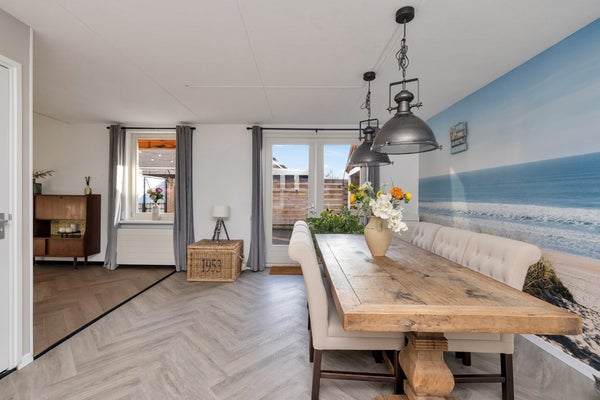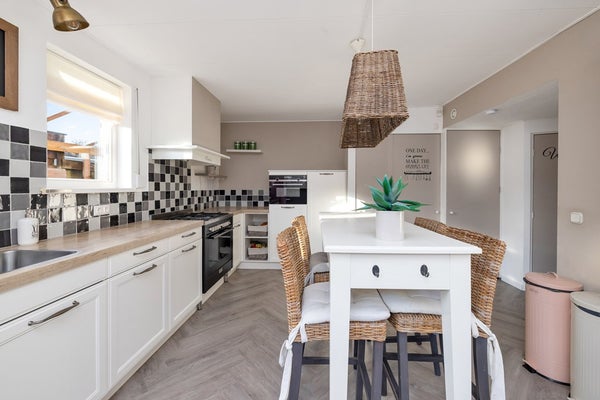 De eetkamer staat in open verbinding met de woonkamer en vormt een centrale plek in de woning. Vanuit hier is er toegang tot de keuken. De keuken is landelijk uitgevoerd en voorzien van diverse inbouwapparatuur, voldoende werkruimte en kastruimte. Aansluitend bevindt zich de bijkeuken met witgoed aansluitingen en extra bergruimte.