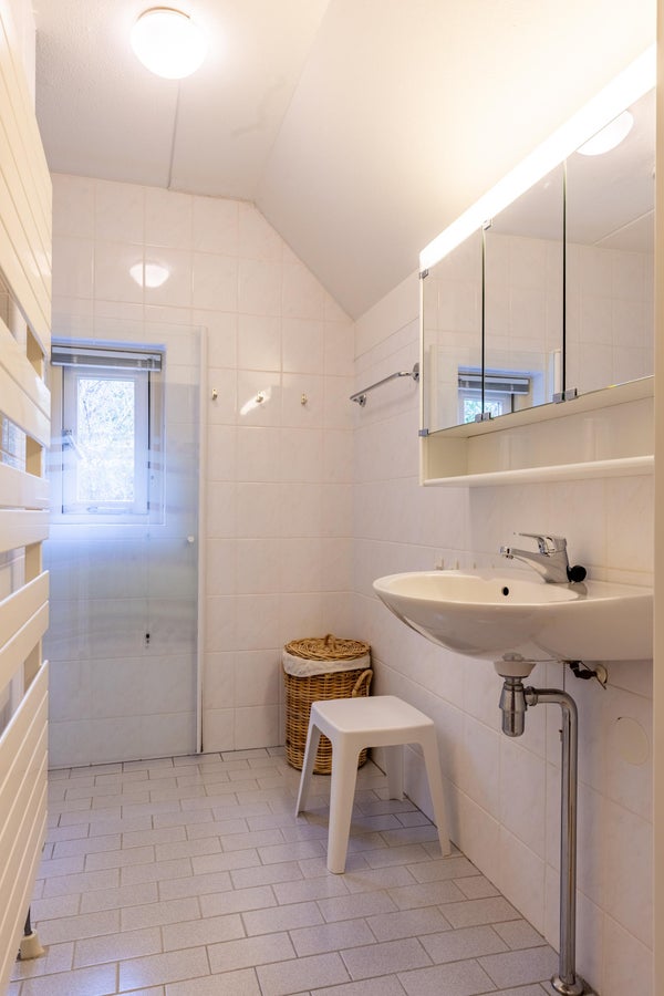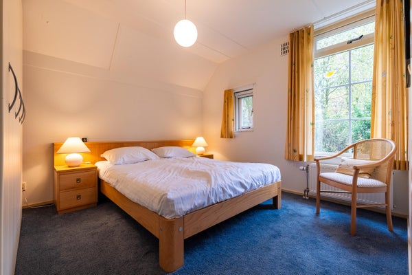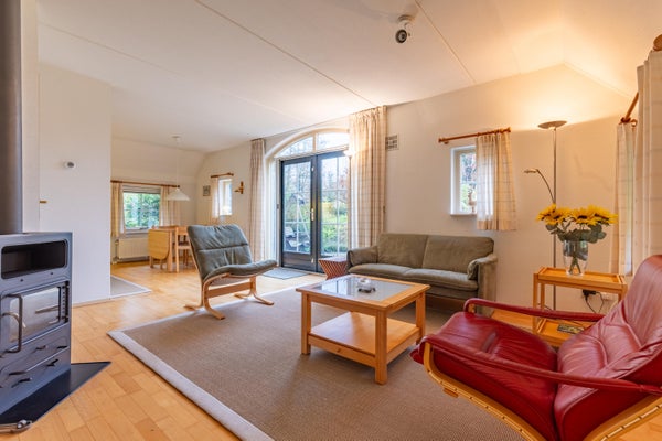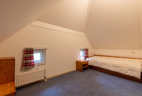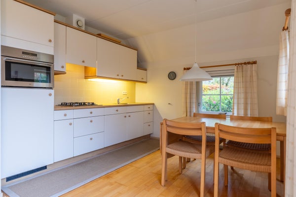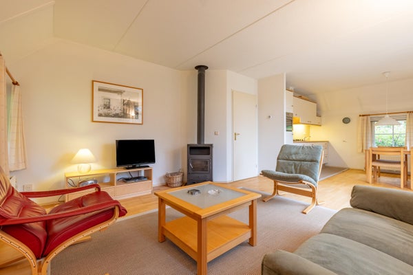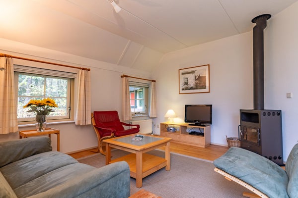 Vooruit, toch eerst maar even de woning bekijken. Binnen stap je in een warm en verzorgd interieur. Want je krijgt deze woning geheel gestoffeerd en gemeubileerd. Geen gedoe met inrichten en klussen. Stofzuigen, wellicht een ander behangetje, en je koffers neerzetten is genoeg. In de hal hangen we onze jas aan de kapstok en zien de meterkast en laten we de trap naar boven nog even links liggen. De woonkamer en open keuken zijn royaal en breed. Openslaande deuren naar de vrij gelegen tuin. De houtkachel maakt een gezellig snorrend geluid en werpt haar warmte lustig de ruimte in. We zien vervolgens de slaapkamer (Auping bedden), badkamer (douche, wastafel), apart toilet en bijkeuken met wasmachine op de begane grond. Buitenom en in stijl aan de woning gebouwd, nog een berging voor fietsen en tuingereedschap. In de hal van de woning liggen plavuizen. Boven zijn nog twee slaapkamers onder het schuine dak. Ook vinden we hier de kast waarin de HR cv-ketel (Bosch uit 2008) is geplaatst. De woning is bij de bouw volledig geïsoleerd en heeft energielabel C.