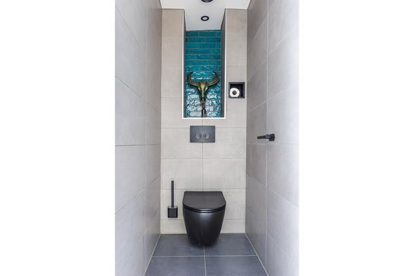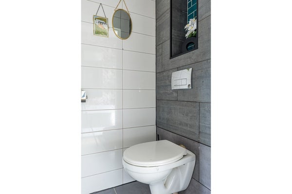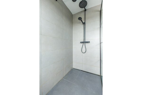 De badkamer is modern ingericht en compleet uitgevoerd met een inloopdouche, wastafelmeubel, designradiator en een spiegel met geïntegreerde verlichting. Een frisse, eigentijdse ruimte die direct klaar is voor gebruik. Daarnaast is er op deze verdieping een separaat toilet, wat extra comfort en praktisch gebruik biedt voor het hele gezin.