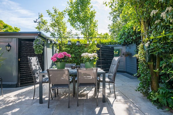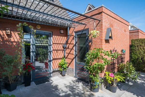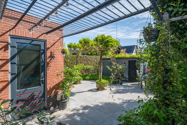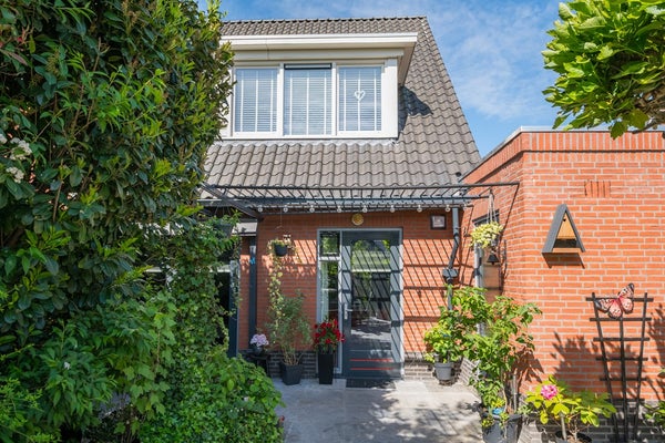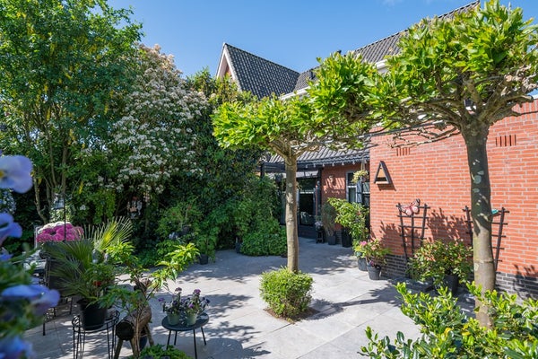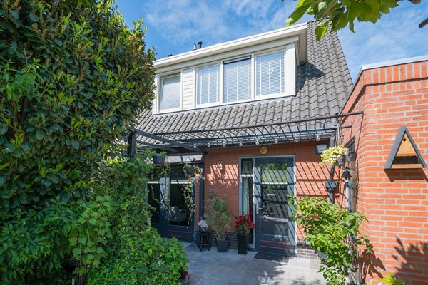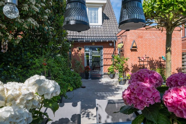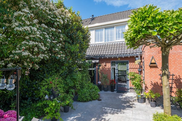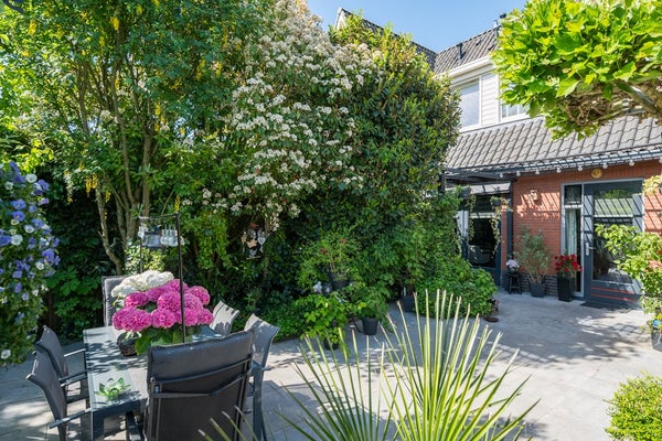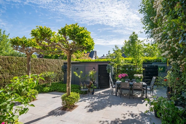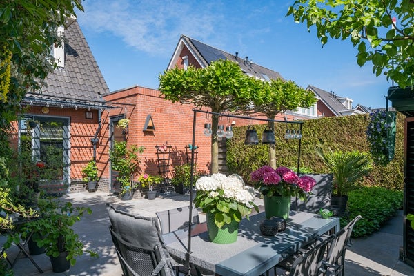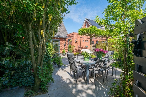 De voortuin is smaakvol aangelegd, terwijl de achtertuin een zonnige oase vormt die naadloos aansluit op de woonkeuken.