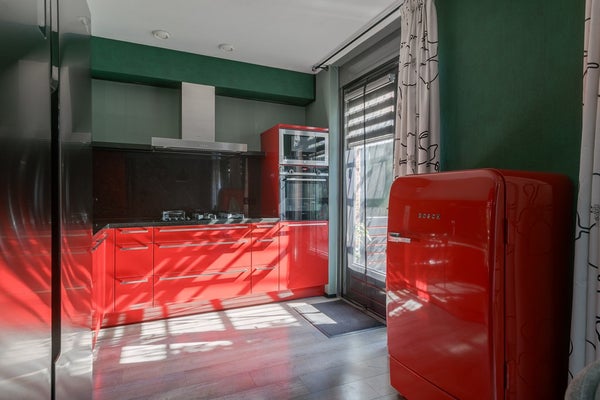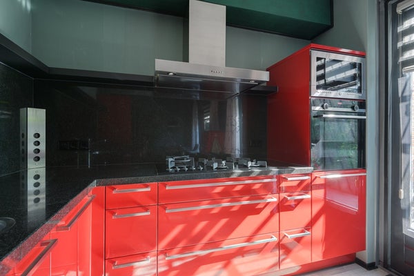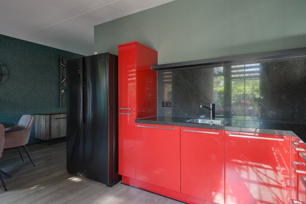 De luxe inbouwkeuken en de sfeervolle woonkamer met openslaande deuren naar de tuin vormen de perfecte setting voor gezellige momenten thuis.