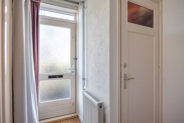 Entree met meterkast, toilet, trapopgang en doorgang naar de woonkamer. De woonkamer geniet van een vrij uitzicht aan zowel de voor- als achterzijde en staat in verbinding met de gesloten keuken. De keuken is voorzien van een eenvoudig basis keukenblok zonder installaties en beschikt over een trapkast en de directe doorgang naar de achtertuin.