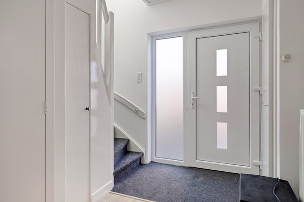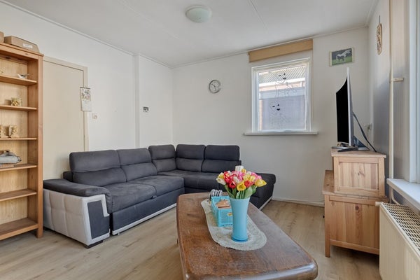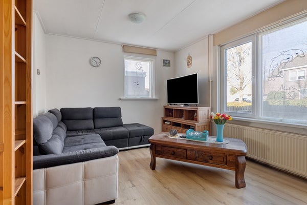 Via de entree met meterkast, toiletruimte en trapopgang kom je binnen in de hal. Vanuit hier heb je toegang tot de lichte en ruime woonkamer aan de voorzijde van de woning. Dankzij de hoekligging en de grote raampartijen geniet je hier van veel natuurlijk lichtinval.