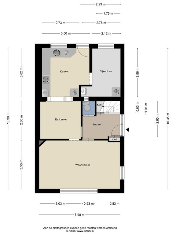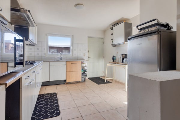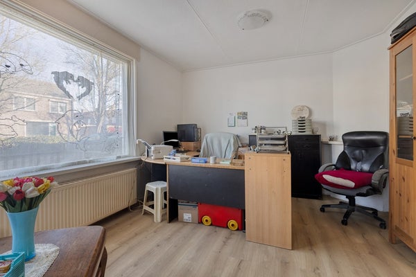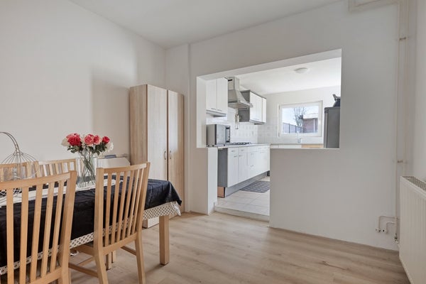 De eetkamer bevindt zich centraal in de woning en vormt een prettige verbinding tussen de woonkamer en de keuken. De keuken is praktisch opgesteld en biedt voldoende werk- en bergruimte. Aansluitend vind je de bijkeuken met extra opstelmogelijkheden voor witgoed en toegang naar buiten, ideaal als achterom of voor extra opslag.