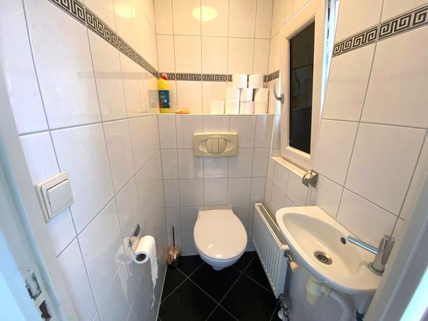 Het toilet is mooi afgewerkt en heeft een aparte wasbak voor extra gemak.