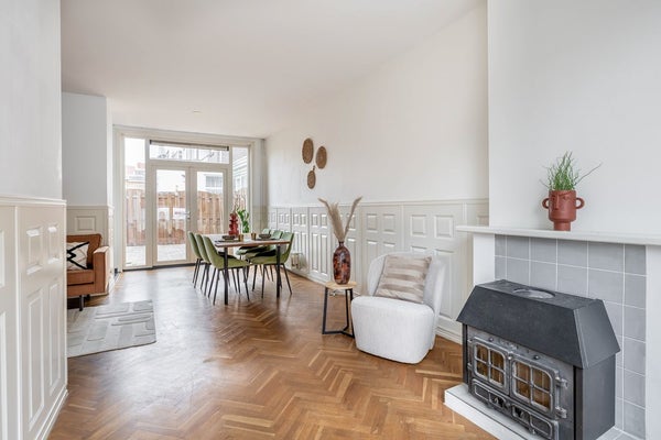Aan de achterzijde bevindt zich de open keuken, met uitzicht op de tuin. Vanuit de keuken heb je direct toegang tot de achtertuin, gelegen op het westen – perfect om na een lange dag nog even van de zon te genieten.