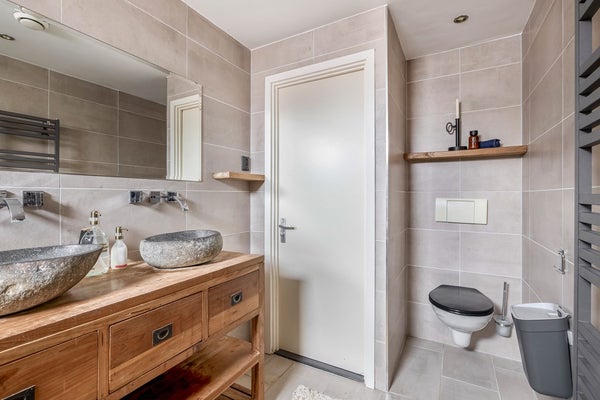 9. Badkamer met inloopdouche, toilet, dubbele wastafel en handdoekradiator