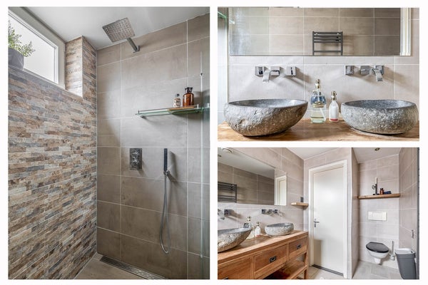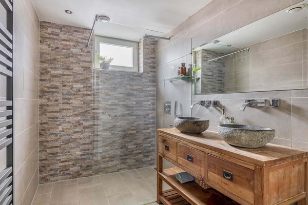 - Badkamer met inloopdouche, toilet, dubbele wastafel en handdoekradiator