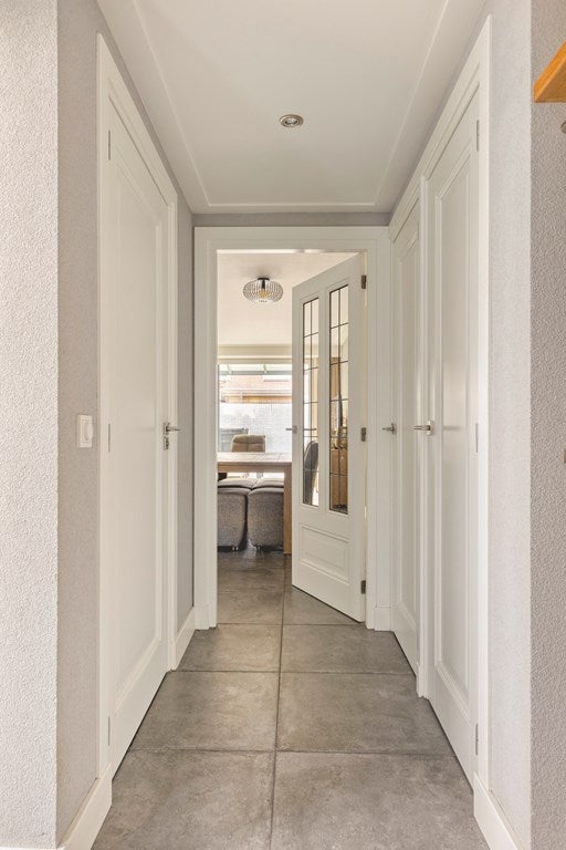 De begane grond kenmerkt zich door een praktische indeling en een hoog wooncomfort. Via de hal heeft u toegang tot een handige berging, een modern toilet en de ruime L-vormige woonkamer. De lichte tegelvloer is voorzien van comfortabele vloerverwarming. Zowel de woonkamer als de keuken zijn afgewerkt met fraai stucwerk op de wanden en plafonds, uitgevoerd met strak lijstwerk. Vanuit de woonkamer zorgt een schuifpui voor een directe verbinding met de zonnige achtertuin. De halfopen, moderne keuken is efficiënt opgesteld in een hoek en beschikt over diverse inbouwapparatuur, waaronder een cooker, vaatwasser, inductiekookplaat, combi-oven, afzuigkap en koelkast.