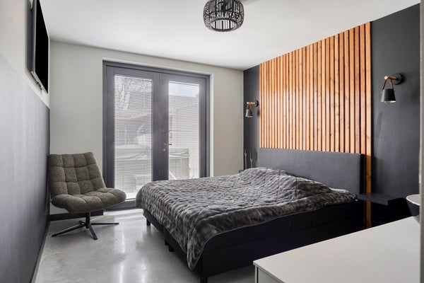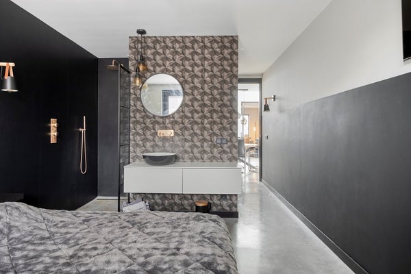 De slaapkamer aan de achterzijde van de woning beschikt over openslaande deuren naar de tuin, waardoor binnen en buiten naadloos met elkaar verbonden zijn. Aangrenzend vindt u de luxe en-suite badkamer, voorzien van een inloopdouche met regendouche, hoogwaardige rosé gouden armaturen en een stijlvol wastafelmeubel in dezelfde afwerking.