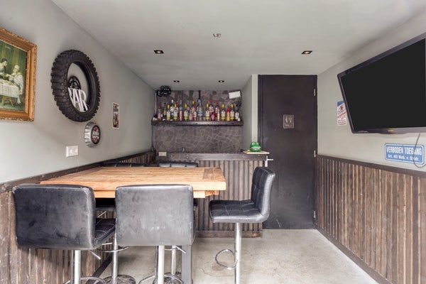 Daarnaast is er een gezellige multifunctionele ruimte, compleet met klein barretje, koeling, spoelbak en separaat toilet — ideaal als hobbyruimte, mancave, thuiskantoor of plek om met vrienden te ontspannen. Een garage die zowel praktisch als bijzonder veelzijdig is.