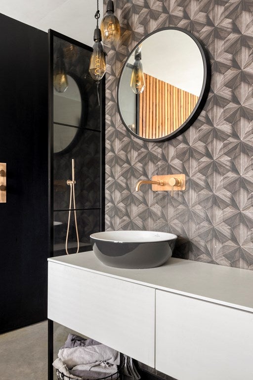 Het tochtportaal biedt toegang tot het moderne toilet, uitgevoerd met wandcloset, urinoir en een wastafel met inbouwkraan in chique rosé goud.