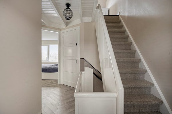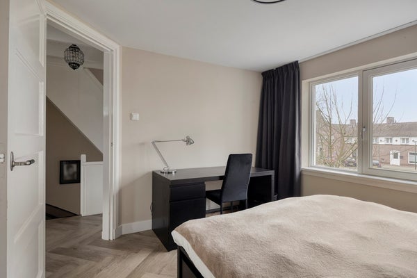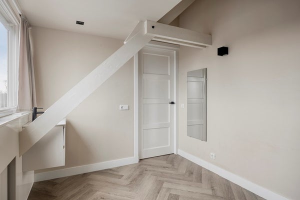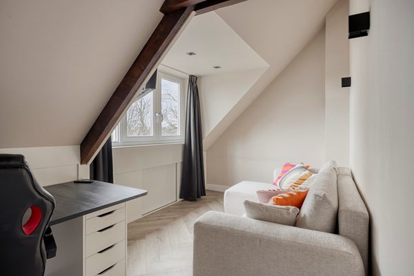 Op de tweede verdieping bevindt zich een overloop met witgoedaansluiting, van waaruit u toegang heeft tot twee ruime slaapkamers. Beide slaapkamers zijn voorzien van een dakkapel, waarbij de achterste kamer is uitgerust met een screen en een praktische wastafel. De kamers zijn hoogwaardig afgewerkt met een PVC-vloer in visgraatmotief en strak gestucte wanden en plafonds. De gehele verdieping beschikt over vloerverwarming en koeling, wat bijdraagt aan een aangenaam en comfortabel binnenklimaat.