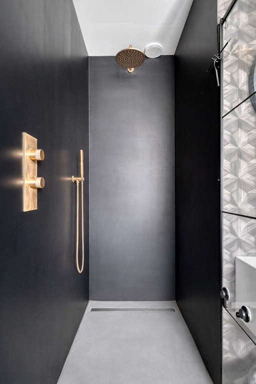 De moderne badkamer is van alle gemakken voorzien en sfeervol uitgevoerd. Hier vindt u een inloopdouche, een ligbad met geïntegreerde tv, een dubbel wastafelmeubel en mechanische afzuiging met vochtsensor. De stijlvolle mat zwarte inbouwkranen geven de ruimte een luxe, eigentijdse uitstraling — een ideale plek om de dag te beginnen of ontspannen af te sluiten.