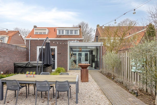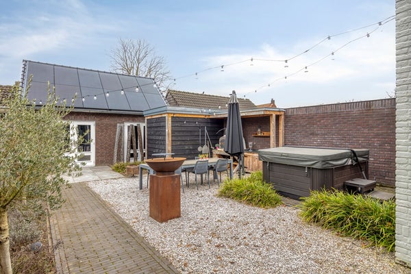 De fraai aangelegde achtertuin is een perfecte combinatie van stijl en comfort. Het terras is gedeeltelijk bestraat met hard gebakken klinkers, terwijl andere delen zijn afgewerkt met grind, wat het geheel speels en onderhoudsvriendelijk maakt. Langs de randen vindt u borders met vaste beplanting, die het geheel groen en levendig houden.