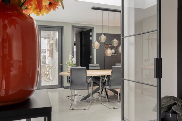 Direct naast de keuken ligt de royale tuinkamer, een lichte leefruimte dankzij de lichtstraat. De kamer is voorzien van een houtkachel, glazen schuifpui en vloerverwarming, waardoor comfort en sfeer het hele jaar door samenkomen.