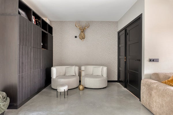 Vanuit de hal bereikt u de L-vormige woonkamer, eveneens afgewerkt met strak stucwerk. De sfeervolle gashaard vormt een warm middelpunt en benadrukt het exclusieve karakter van de ruimte. De woonkamer biedt toegang tot de woonkeuken en de kelder (standplaats water ontharder). Moderne stalen deuren scheiden woonkamer en keuken elegant van elkaar, waardoor openheid en privacy perfect in balans zijn.