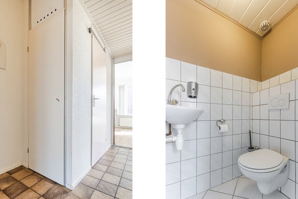 • Het toilet in de hal is half betegeld en heeft een hangend closet met fonteintje.