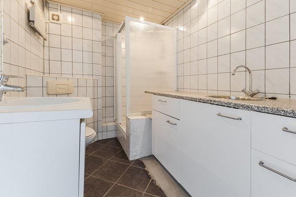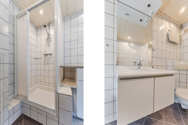 • De badkamer (ca. 5,5 m²) is volledig betegeld, voorzien van een douchehoek, 2e toilet met hangend closet, wastafel met meubel, handdoekkenkastje, aanrechtblok en inbouwverlichting.