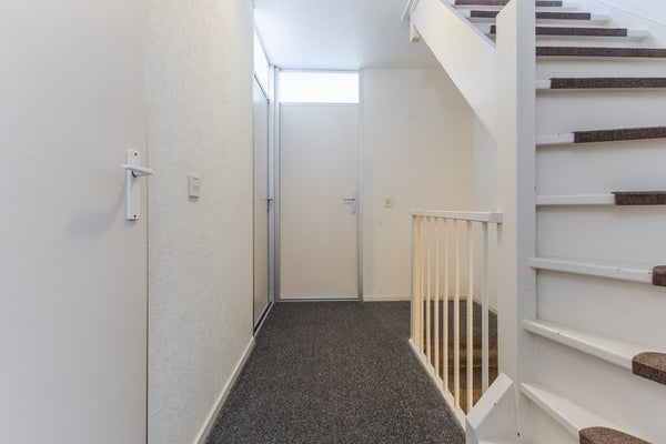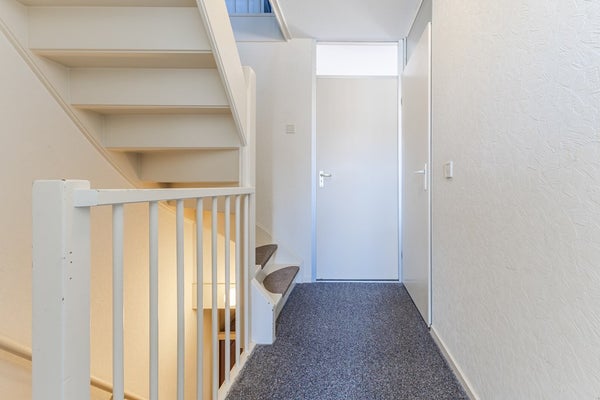 Entree via de voorzijde van de woning naar hal met toilet, meterkast, trapopgang en toegang tot een slaap-/hobbykamer aan de voorzijde.