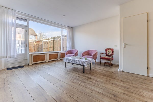 • Tuingerichte woonkamer van ca. 24 m² met trapkast en deur naar de achtertuin.