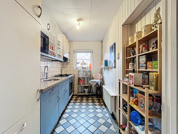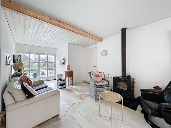 Betreedt de woning middels de voordeur om in de hal uit te komen. Dit is een ruime hal met (vernieuwde) meterkast, trap en trapkast. Tevens is er een toilet gesitueerd. Lopen we verder, dan stappen we de woonkamer binnen. Deze woonkamer is verrassend ruim en biedt plaats voor een gezellige zithoek en een eettafel. Het heeft een speelse indeling, waardoor je de ruimte op verschillende manieren kan inrichten. Met de houtkachel wordt het sfeervol verwarmd en de twee schuifpuien zorgen voor veel lichtinval en een goede connectie met buiten. De airco zorgt ervoor dat je kan koelen in de zomer en verwarmen in de winter. Vervolgens betreden we de bijkeuken in de aanbouw. Deze bijkeuken biedt weer toegang tot de keuken aan de voorzijde en de badkamer aan de achterzijde. Ook langs hier is nog eens de tuin te betreden. Verder zijn hier ook de witgoedaansluitingen te vinden. De keuken is voorzien van diverse apparaten, zoals een 4-pits gastoestel, afzuigkap, oven, magnetron en koelkast. Tenslotte is de badkamer ingericht met een douche, wastafel en een toilet, maar ook de CV-ketel uit ca. 2006 hangt hier.