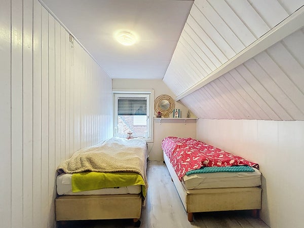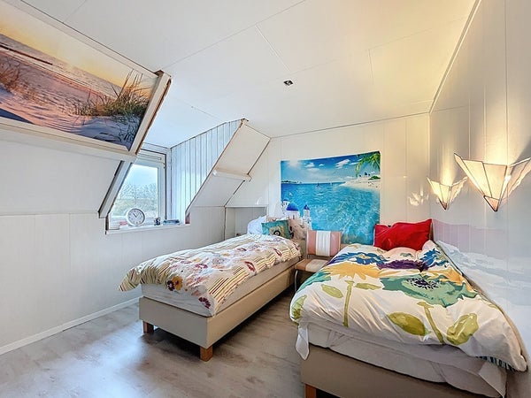 Via de trap in de hal wordt de overloop van de eerste verdieping betreden. Deze overloop biedt toegang tot de drie slaapkamers. Twee slaapkamers zijn slaapkamers voor een tweepersoonsbed en een kledingkast. De derde slaapkamer is een leuke kinderkamer, welke nog verder afgewerkt dient te worden. Het heeft een vaste trap naar de zolder om te gebruiken als extra slaapzolder. Verder past er een éénpersoonsbed en een kledingkast in de kamer. De dakkapellen aan de achterzijde zorgen net voor het beetje extra ruimte in de slaapkamer dat je nodig hebt. Op de verdieping zijn alle kozijnen van kunststof met dubbel glas. Tenslotte is er nog een kamer in gebruik als opslag/kledingkamer.