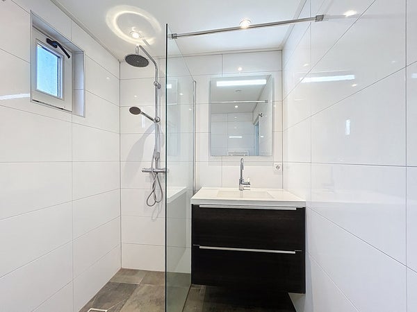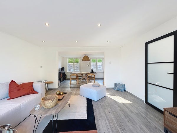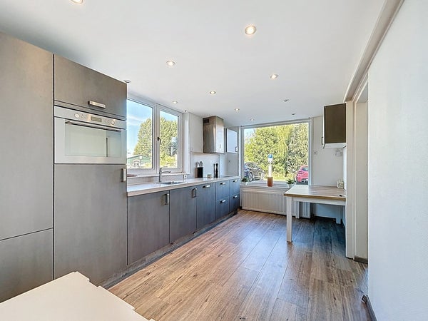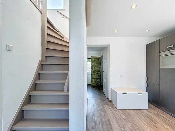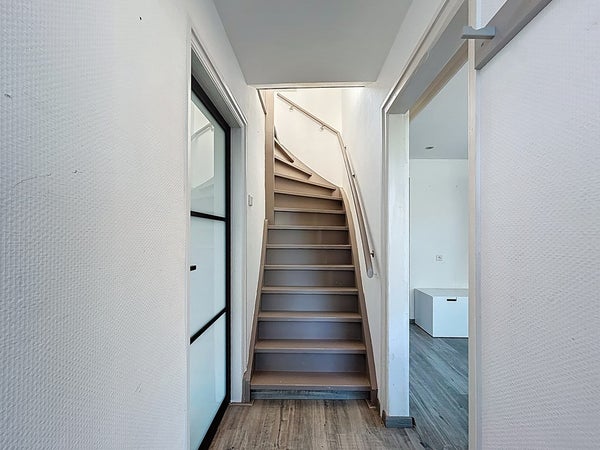 Je stapt binnen in een nette hal die toegang biedt tot de woonkamer. De lichte woonkamer is afgewerkt met een moderne laminaatvloer en vormt samen met de keuken een gezellige leefruimte. De keuken is uitgerust met een 4-pits inductiekookplaat, vaatwasser, combimagnetron en koelkast – alles wat je nodig hebt om heerlijk te koken. De moderne badkamer is eveneens op de begane grond te vinden en beschikt over een ruime inloopdouche, wastafelmeubel, hangtoilet en een design handdoekradiator. Aansluitend bevindt zich de praktische bijkeuken met extra bergruimte.