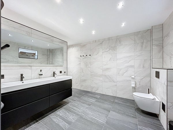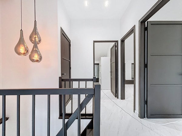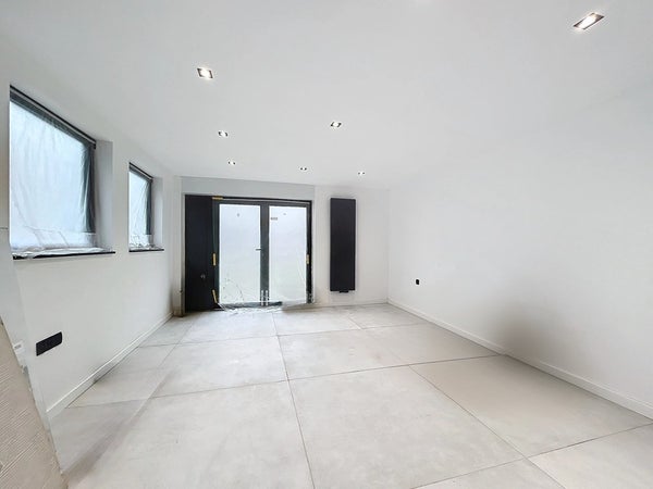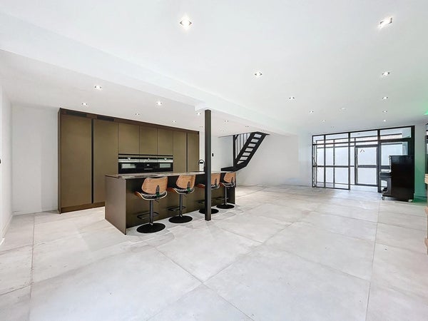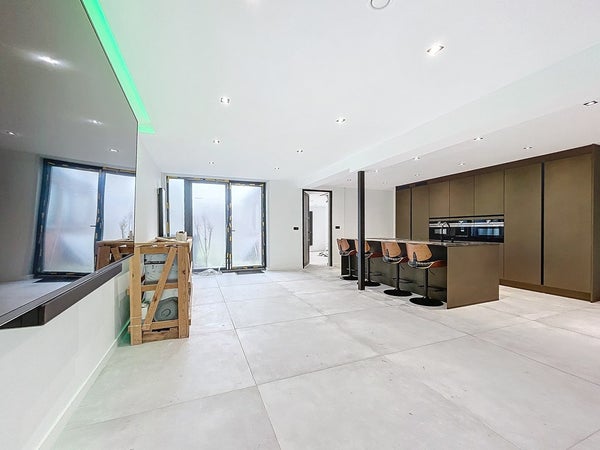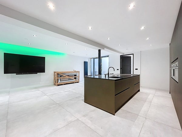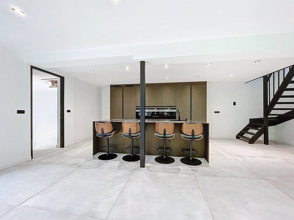 Het unieke pand is te betreden middels de voordeur met raampartijen. Hierdoor heb je een ruime en lichte inkom met genoeg ruimte voor een garderobe. Ook is hier plaats gemaakt voor de uitgebreide meterkast. Rechts stappen we eerst de badkamer binnen. En wat een prachtig begin van de rondleiding is dit. Deze ruimte is erg ruim van opzet en biedt plaats voor twee wastafels, een toilet, een handdoekradiator en achter de wand wacht een leuke verrassing: twee douches én een Sunshower! Vervolgens gaan we verder naar de royale woonkamer. Hier valt ook direct de strakke afwerking op en de grote vloertegels van maar liefst 1,2 x 1,2 meter! Dat zie je niet vaak. Er is alle ruimte voor een gezellige zithoek en een lange eettafel. De keuken is toch wel echt dé eyecatcher. Het royale kookeiland biedt genoeg plaats om meerdere barkrukken aan te zetten en verder is de keuken voorzien van inductie (Bora), een Quooker, vaatwasser, koelkast, vrieskast, een ingebouwde koffiemachine, een waterdamp oven en een combioven. Tenslotte wordt de aanbouw betreden. Deze kan gebruikt worden als slaapkamer, waardoor gelijkvloers leven mogelijk wordt gemaakt. Uiteraard kan je het ook inzetten als kantoor/salon, hobbyruimte of speelkamer voor de kinderen. Middels de vlizotrap wordt de ruimte boven de aanbouw betreden. Deze ruimte is ook nog groter dan je zou denken en kan zelfs mogelijk als extra slaapkamer worden gebruikt (hiervoor zal je wel even een vaste trap moeten zetten).