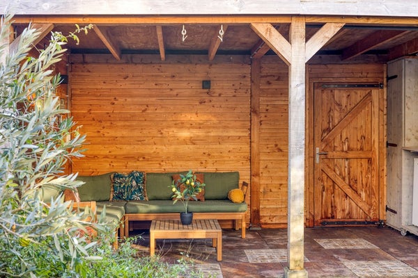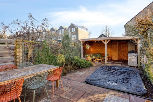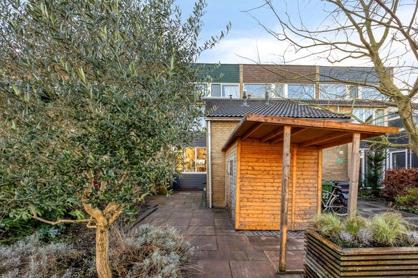 De fraai aangelegde achtertuin kent een ligging op het zuiden en is voorzien van een achterom en een moderne overkapping.