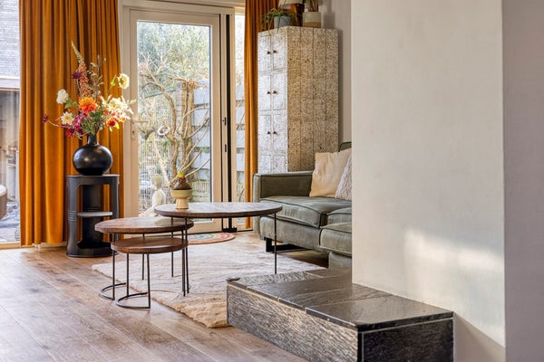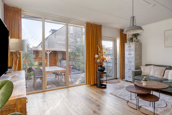 Ruime open woonkamer voorzien van een sfeervolle houten parketvloer en gashaard, welke door de plaatsing middenin de ruimte voor een speelse indeling zorgt. De woonkamer wordt van een behoorlijke dosis daglicht voorzien door de kamerhoge raampartij en via de achterdeur is er toegang tot de fraai aangelegde tuin.
