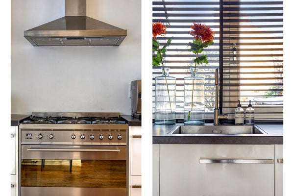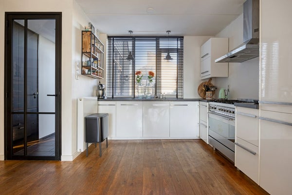 Open keuken aan de voorzijde van de woning. De keuken is voorzien van een koelkast, een vriezer, een Smeg gasfornuis met 6 pitten en ruime oven, een vaatwasser en een afzuigkap.