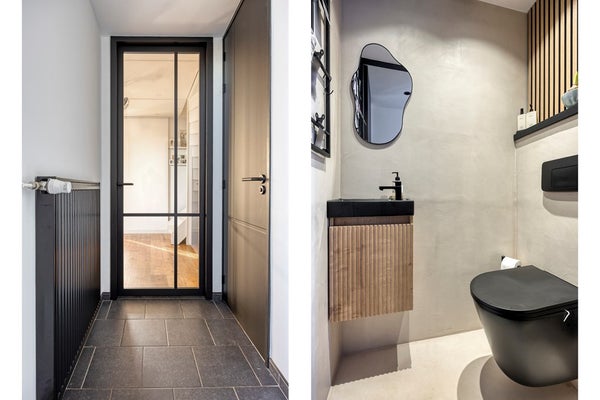 Moderne toiletruimte voorzien van zwevend toilet en fonteintje.