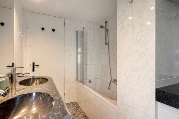 De badkamer is compleet en voorzien van een bad met douche, een wastafelmeubel met dubbele wastafel, een tweede toilet en de opstelplaatsen voor de wasmachine en droger.