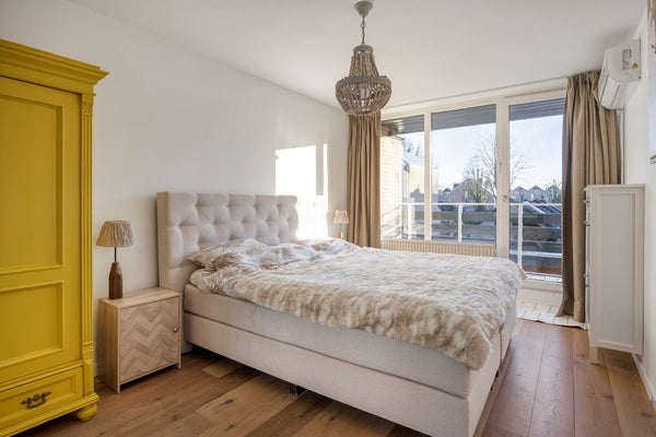 Ouderslaapkamer aan de achterzijde van de woning met toegang tot het balkon. Deze slaapkamer is voorzien van airconditioning.