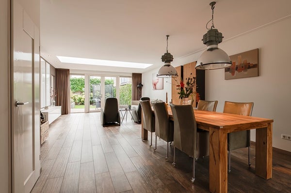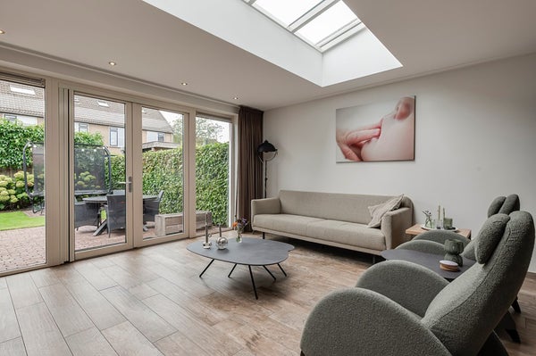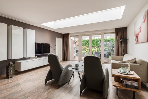 De begane grond heeft een prachtige aanbouw met een brede lichtstraat. Ook de achterpui is fraai en biedt veel daglichttoetreding.