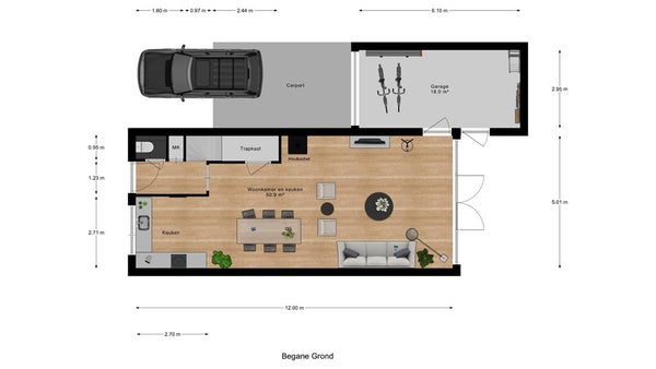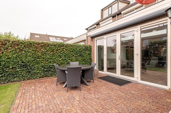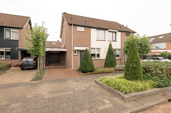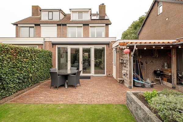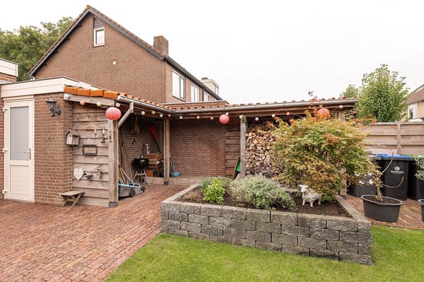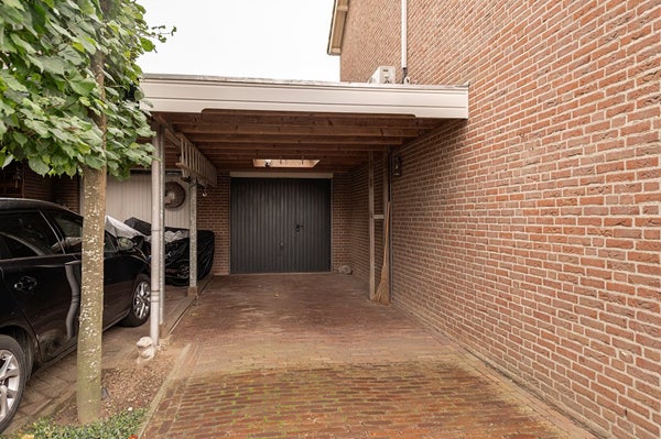 De voortuin heeft een eigen oprit met carport; zo parkeer je altijd droog aan huis. Aansluitend vind je de aangebouwde garage met kanteldeur met loopdeur én een praktische loopdeur naar de tuin.