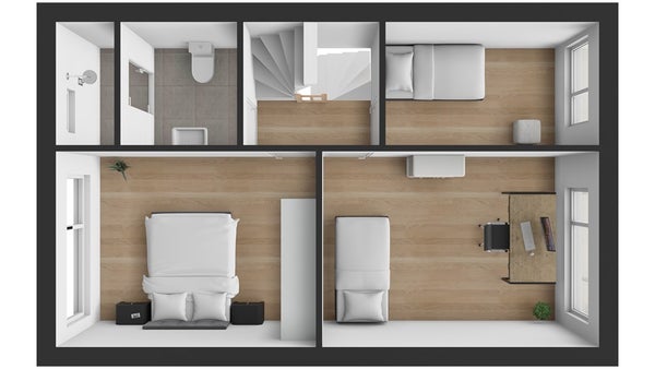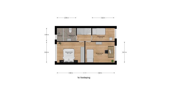 Op de eerste verdieping tref je drie fijne fijne slaapkamers van respectievelijk 13, 12 en 6 m2, met rechte gevels en dus een goed bruikbaar oppervlak.