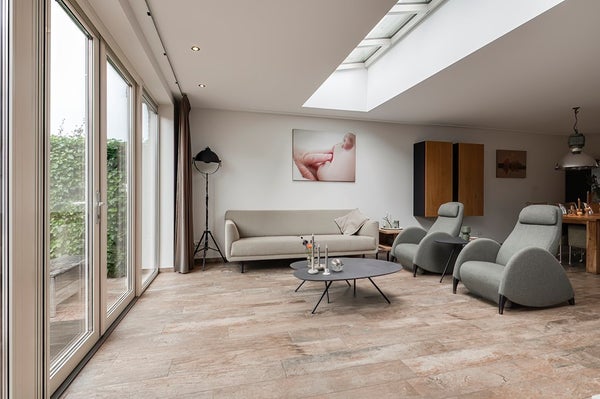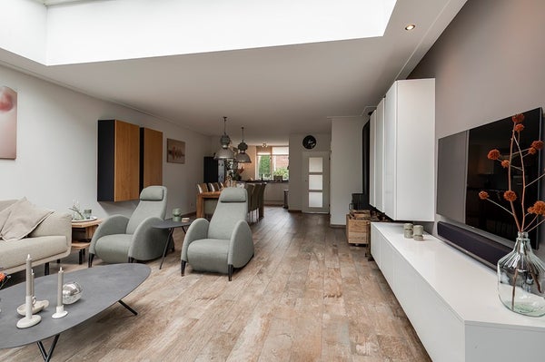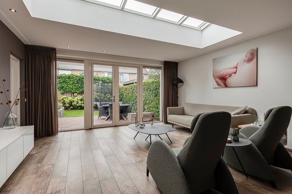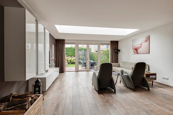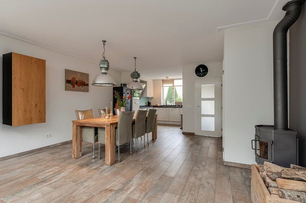 De tuingerichte living is aan de achterzijde uitgebouwd en krijgt extra licht via de royale lichtstraat. De houtkachel zorgt voor sfeer op koude dagen; op de vloer liggen keramische tegels met vloerverwarming. Dubbele tuindeuren verbinden binnen met buiten.