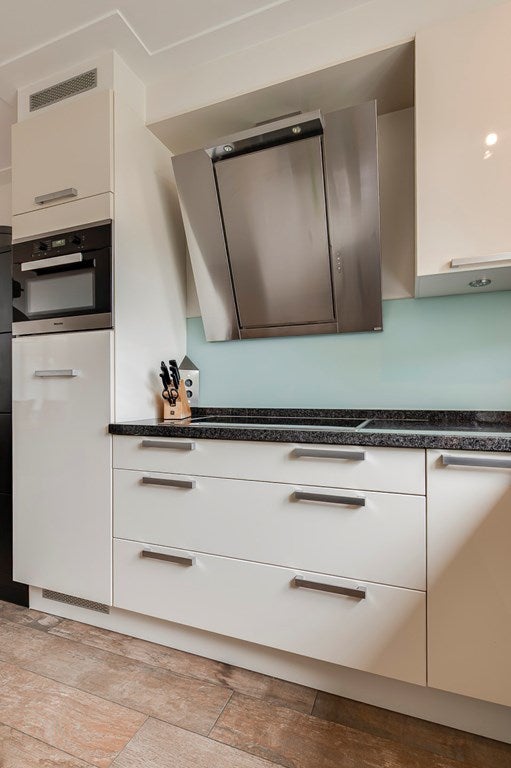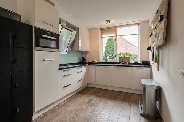 Aan de voorzijde ligt de complete L-keuken met inbouwapparatuur (inductiekookplaat, afzuigkap, oven, combimagnetron, vaatwasser en koelkast).