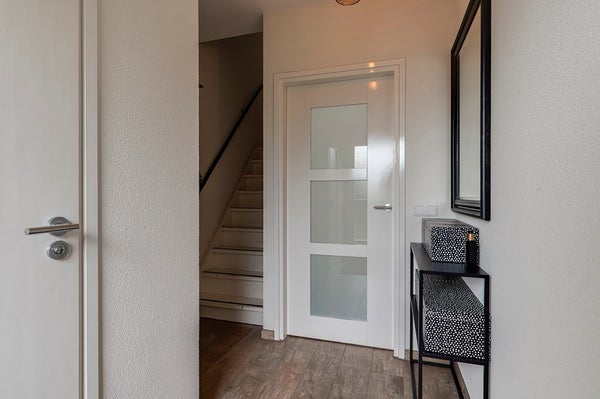 Via de overdekte entree kom je in de hal met modern toilet, garderobe en trapopgang.