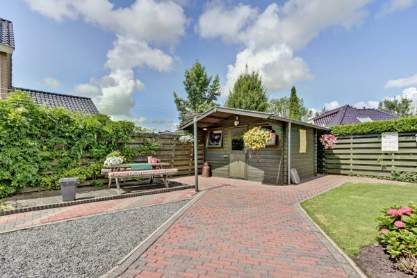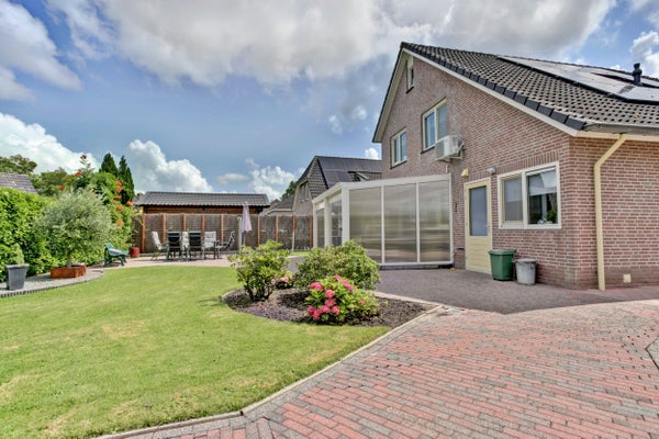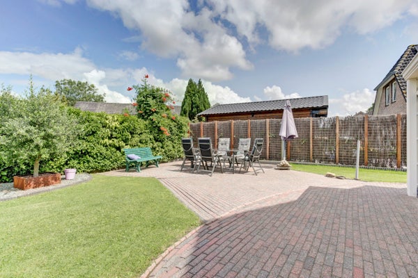 De verzorgde tuin rondt het geheel af, met plaats voor twee auto’s op eigen terrein.