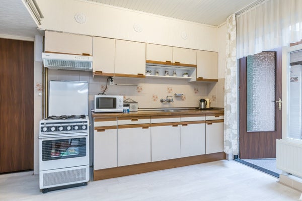 De gesloten keuken is voorzien van een functionele keukeninstallatie. Voor wie eigentijds wil wonen: hier ligt een mooie kans. Door de keuken (deels) te openen ontstaat een moderne halfopen keukenopstelling die perfect aansluit bij de leefruimte. De basis is solide – de invulling bepaalt u zelf.