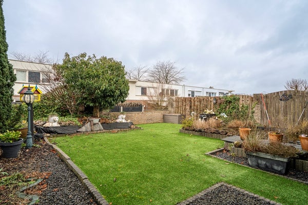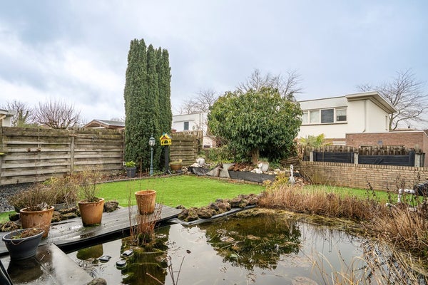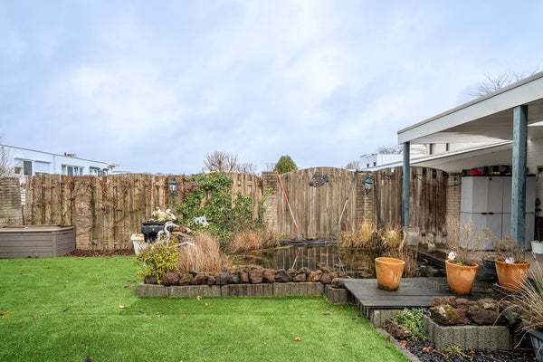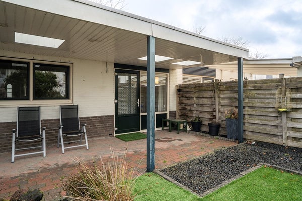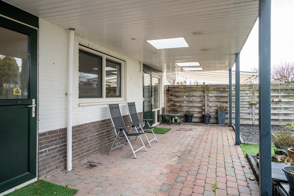 Aansluitend bevindt zich de keuken met inbouwapparatuur en een separaat werkblok met extra kastruimte. De aansluitende eetkamer biedt een mooi zicht op de verzorgde achtertuin. Over de volledige breedte van de woning is een ruim terras met overkapping gerealiseerd, voorzien van lichtkoepels — een heerlijke plek om vrijwel het hele jaar door buiten te genieten.