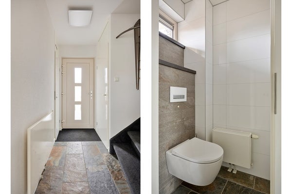 De woning ligt middels parkeerhavens en een trottoir met groenstrook rustig afgeschermd van de straat. Via de beschutte voortuin komt u bij de fraaie gevel van de woning waar u via de moderne deur binnenkomt in de hal. Deze biedt plaats aan de meterkast, de trapopgang naar de 1e verdieping, een nette toiletruimte en de toegang naar de living.