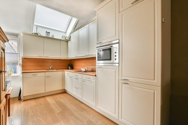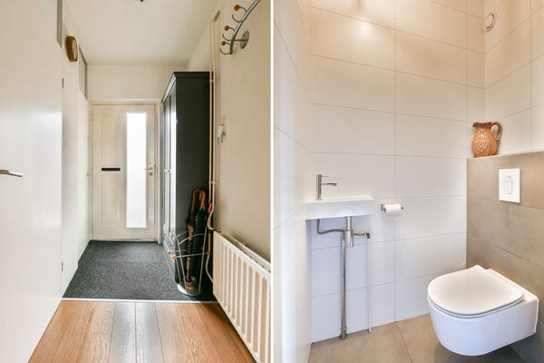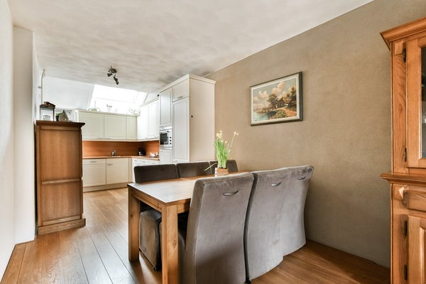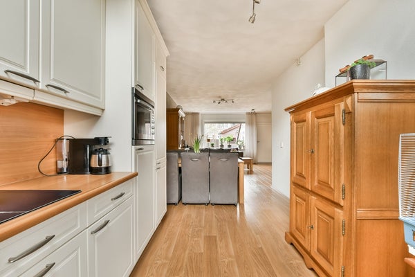 Keurige entree in de hal met de nette toiletruimte (2021) v.v. zwevend toilet en fonteintje, garderobe, meterkast en trapopgang. De L-vormige woonkamer is verdeeld in een zitgedeelte bij de tuinzijde en een eetgedeelte dat grenst aan de open keuken aan de straatzijde. De ruimte biedt een praktische trapkast en aan de achterzijde is er toegang tot het achterportaal met de witgoedaansluitingen. De open keuken is geplaatst in een L‑opstelling met onder andere een inductiekookplaat, vaatwasser en koel‑/ vriescombinatie. Het dakraam zorgt hier voor een prettige lichtinval en zowel de raampartijen aan de straat- als tuinzijde zijn uitgerust met rolluiken.